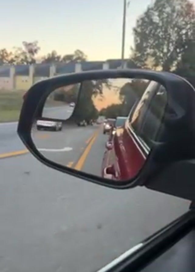 The video, shot from the interior of a moving vehicle, presents a view through the side mirror