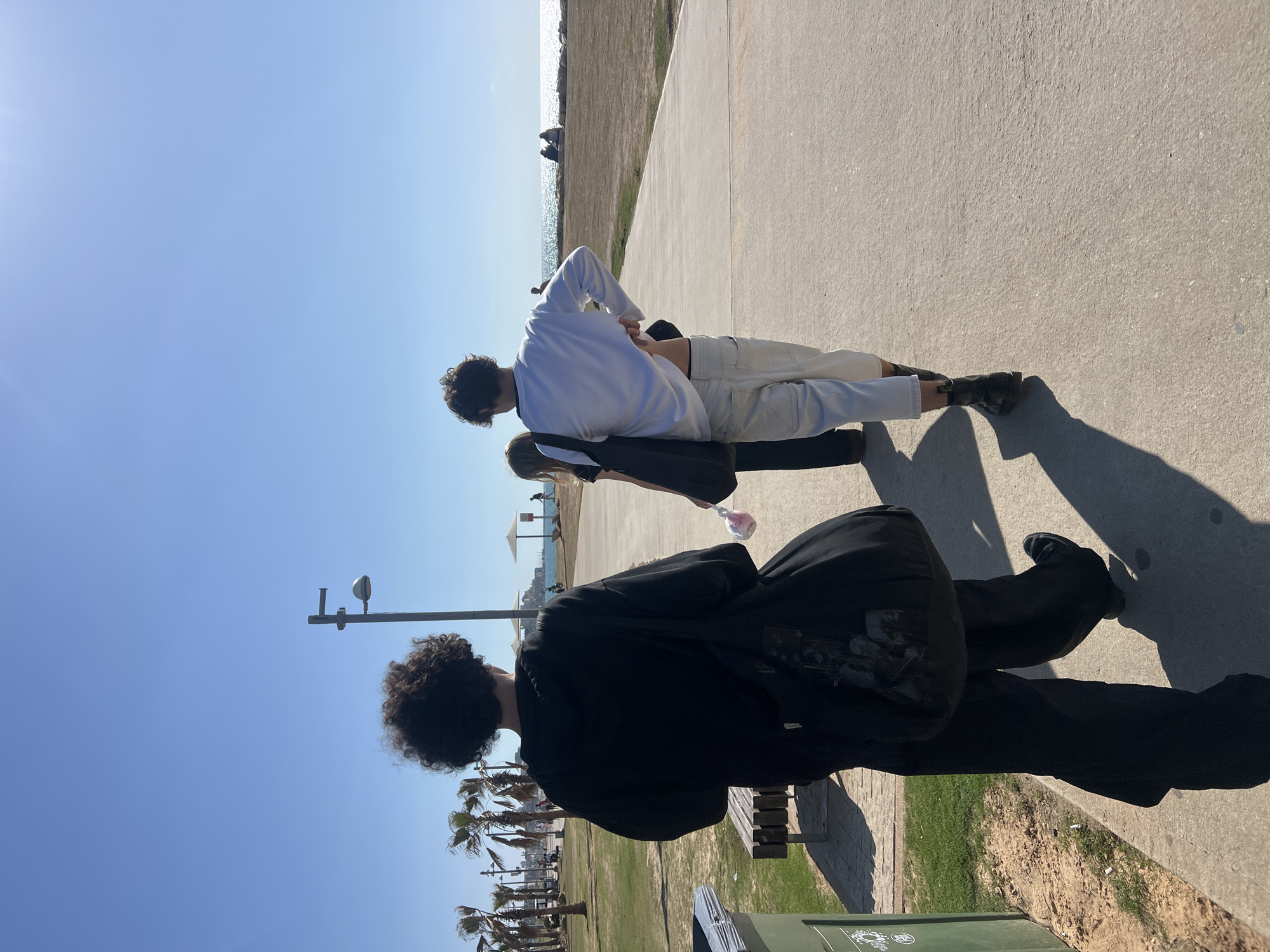 The image depicts a sunny outdoor scene on a coastal promenade. While the location is indicated as Al Jizah, Jordan, the visual evidence shows a seaside environment. Three individuals are walking away from the camera on a light-colored paved path that runs parallel to a large, shimmering body of water, consistent with an ocean or sea, on the right. To the left of the path is a grassy area dotted with numerous palm trees and two slatted wooden benches. A green rectangular trash bin with a grey lid is visible in the lower-left foreground. In the distance, two dark beach umbrellas are seen on a sandy/rocky shoreline, with people seated beneath them. A tall metal lamp post with a white light fixture stands in the mid-ground on the left. The leftmost individual, appearing male, has dark curly hair and wears a black long-sleeved top and black wide-leg pants, carrying a large black tote bag with a faded graphic print on their left shoulder. The middle individual, partially obscured, has long light-brown hair and holds a pink, fluffy object in their right hand. The rightmost individual, also appearing male, has dark curly hair and wears a white long-sleeved shirt with black trim, light-colored cargo pants, and dark ankle boots. Their left hand is on their lower back, causing the shirt to ride up slightly, exposing a portion of their waist. The bright sun casts distinct shadows forward and to the right of the individuals on the path, under a clear blue sky.