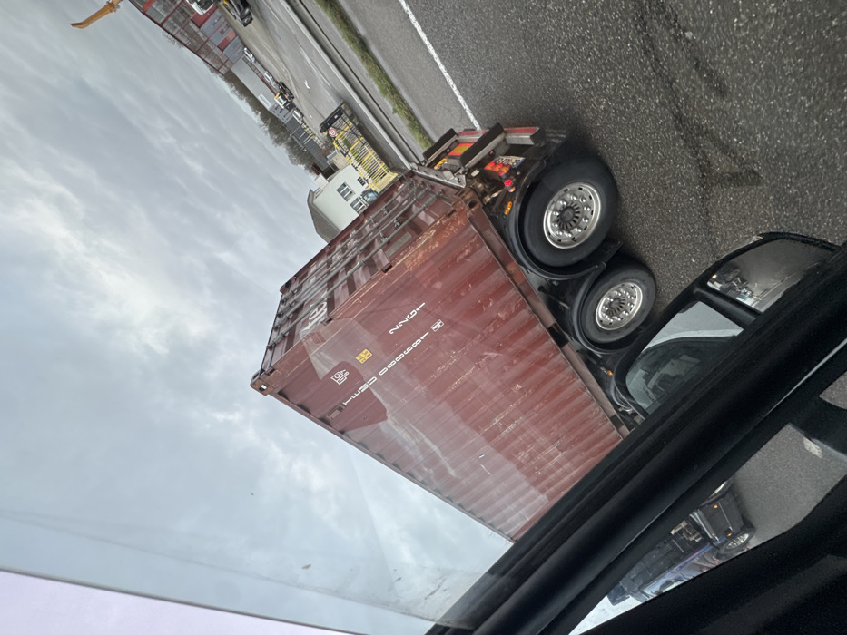 The image depicts an outdoor scene under an overcast sky in Fegersheim, France. A dark red, weathered shipping container, marked "TCSU 086989 2" and "42G1", is observed from the right side. It is loaded onto a multi-axle semi-trailer, visible with two axles featuring dual wheels and reflective hubcaps. The trailer's rear lighting assembly is illuminated. The vehicle is situated on an asphalt road with a prominent white lane line and visible tire tracks on the wet surface. The photograph is captured from within another vehicle, with portions of the dashboard, window frame, and rearview mirror visible in the foreground. The rearview mirror reflects part of a truck behind the camera's position. In the background, a light-colored building with a brown roof stands near a yellow barrier, adjacent to industrial-style buildings and leafless trees. A segment of a yellow construction crane arm is visible on the far right.