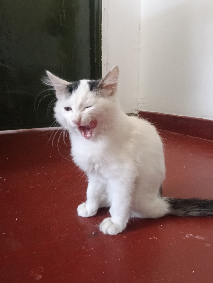 A white domestic cat with black markings on its head and ears is seated on a reddish-brown floor in an indoor setting. The cat's mouth is open wide, with its tongue visible, and its right eye is closed in a distinct wink, while its left eye is partially closed, indicative of a yawn or a lick. Its tail, which appears dark, extends towards the right of the frame. The background features a dark vertical panel, possibly a door or door frame, on the left, and a plain white wall on the right, displaying minor surface imperfections and discoloration. The specific location within Nairobi, Kenya, cannot be determined from the visual information provided in the image.