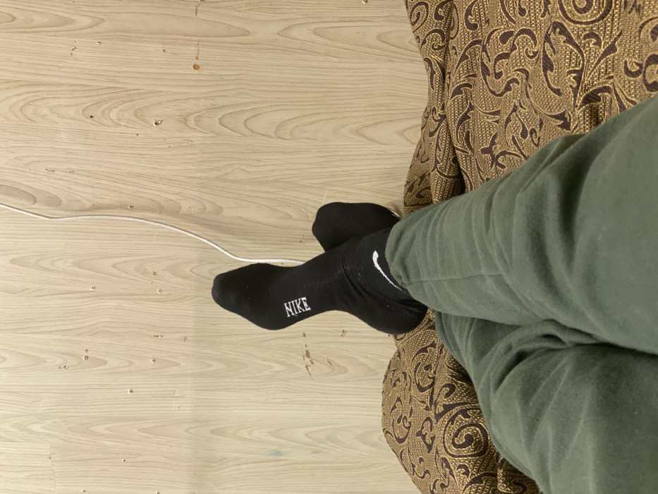 - "A person wearing olive green sweatpants and black Nike socks is resting their crossed legs on a brown patterned couch" by FM-2nUQI2, licensed under CC BY 4.0