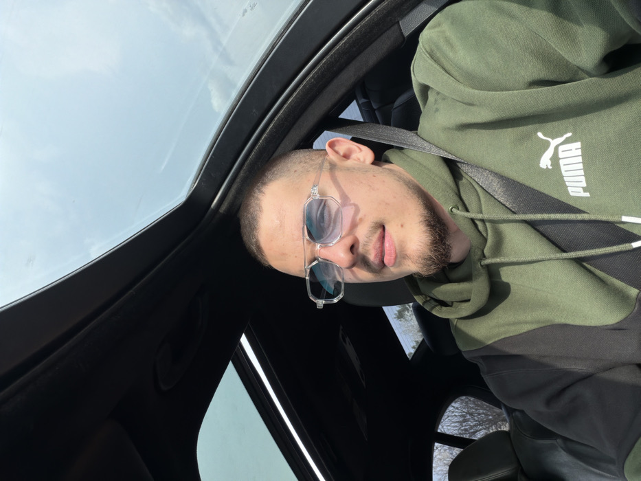 A young adult male is depicted seated in the driver's position within a vehicle, located in Yoakim Gruevo, Bulgaria. He has a short buzz cut and light stubble on his chin and upper lip. He wears octagonal, clear-framed sunglasses with light blue gradient lenses. His attire consists of a multi-toned dark green and black hooded sweatshirt, displaying a white "PUMA" logo on the chest. A dark-colored seatbelt is fastened across his left shoulder and chest. The subject is looking upwards and slightly to his right, towards an apparent light source. The vehicle's interior is dark, with an open sunroof above revealing a partly cloudy, bright sky. Through the left side window, bare trees or dormant vegetation are visible in the background, indicating an outdoor, daytime scene.