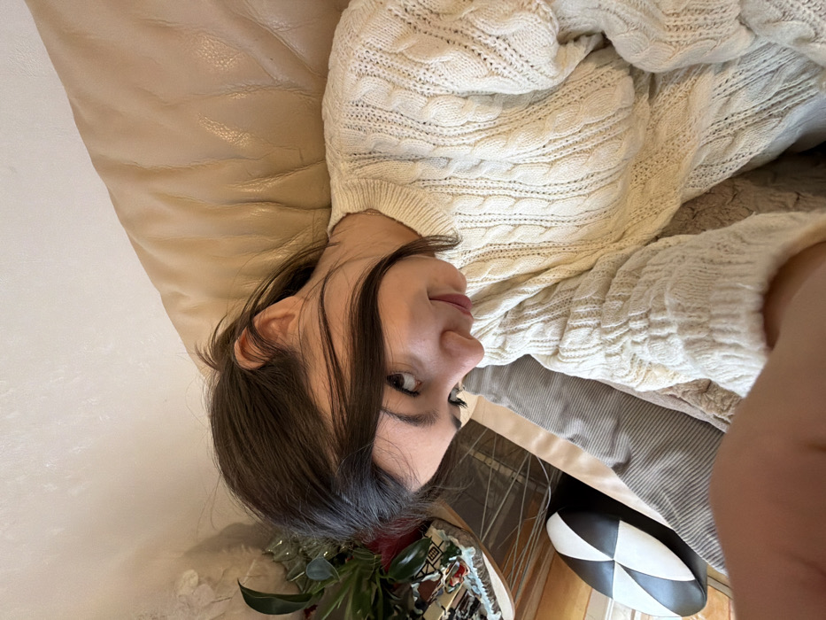A person with dark hair and fair skin lies on a beige couch, wearing a cable knit sweater