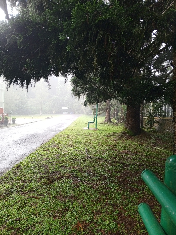 A damp scene showcases a rain-slicked road bordering a lush green lawn. A large, overhanging tree dominates the upper frame, its foliage casting shadows. Green metal pipes stand on the lawn, one L-shaped and another in the foreground. A building is partially visible on the left. The misty atmosphere obscures the background, giving a sense of depth and tranquility.