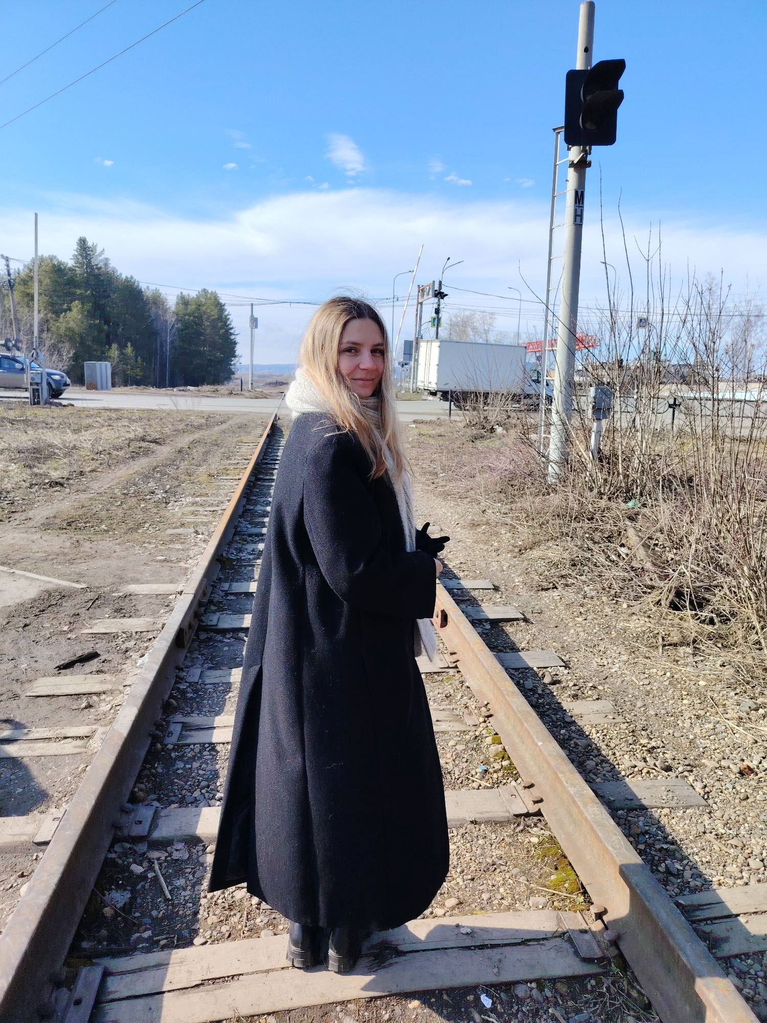A woman stands on a railroad track in Chaikovsky, Russia. She wears a long, black coat and a light-colored scarf. The railroad track runs through a gravelly area with sparse vegetation. In the background, there is a line of trees and a blue sky with scattered clouds. A utility pole with a signal light is visible to the right of the woman. The setting suggests an urban or suburban area with industrial or transportation infrastructure.
