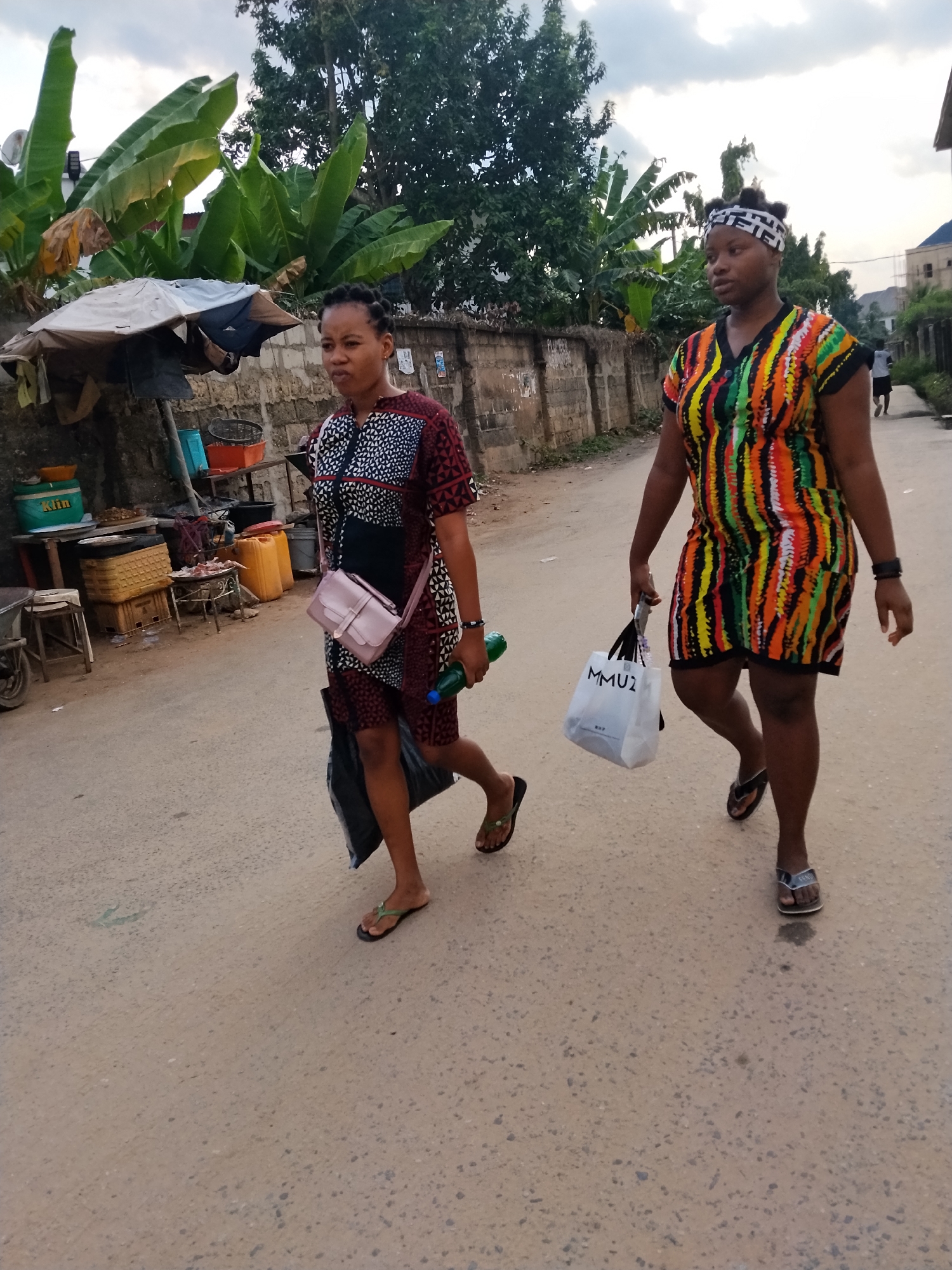 The image displays a street scene in Aba, Abia, Nigeria, under an overcast sky. Two adult females are walking side-by-side on an unpaved, granular road. The female on the left wears a short-sleeved dress with maroon, black, and white geometric patterns, a pink crossbody bag, and green flip-flops. She holds a green plastic bottle in her right hand and a black bag in her left. The female on the right wears a short-sleeved dress with vertical stripes in black, green, orange, red, and yellow, a black and white patterned headband, and dark-colored flip-flops. She carries a white shopping bag labeled "MMU2" in her left hand. To the left of the subjects, a makeshift market stall is visible, covered by a tattered white and blue umbrella. The stall displays various items, including a blue plastic basin, an orange plastic basket, yellow woven baskets, plastic jerrycans, a white bucket labeled "Klin," and what appears to be cuts of meat on a table. Behind the stall is a low stone wall topped with security spikes or barbed wire, followed by dense green vegetation, including large banana leaves and trees. On the right side of the road, more green trees and foliage are present. In the far background on the right, a third individual, appearing to be male, walks away from the camera, and a residential building with a blue roof is partially visible.