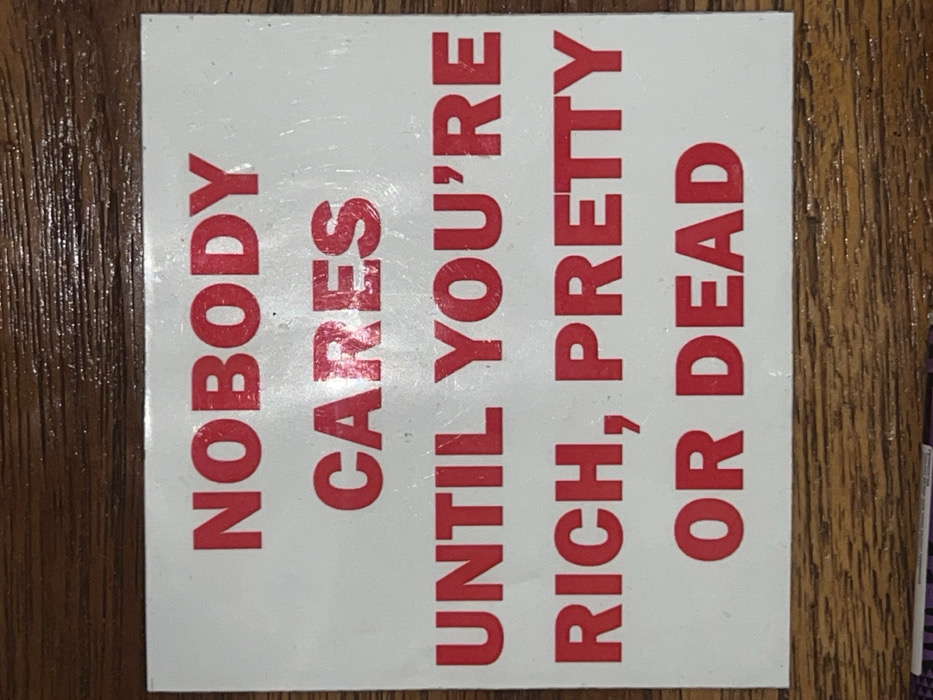 - "A rectangular white sign with red uppercase text reading "NOBODY CARES UNTIL YOU'RE RICH, PRETTY OR DEAD" is centered on a reddish-brown wooden surface" by FM-kzzMn1, licensed under CC BY 4.0