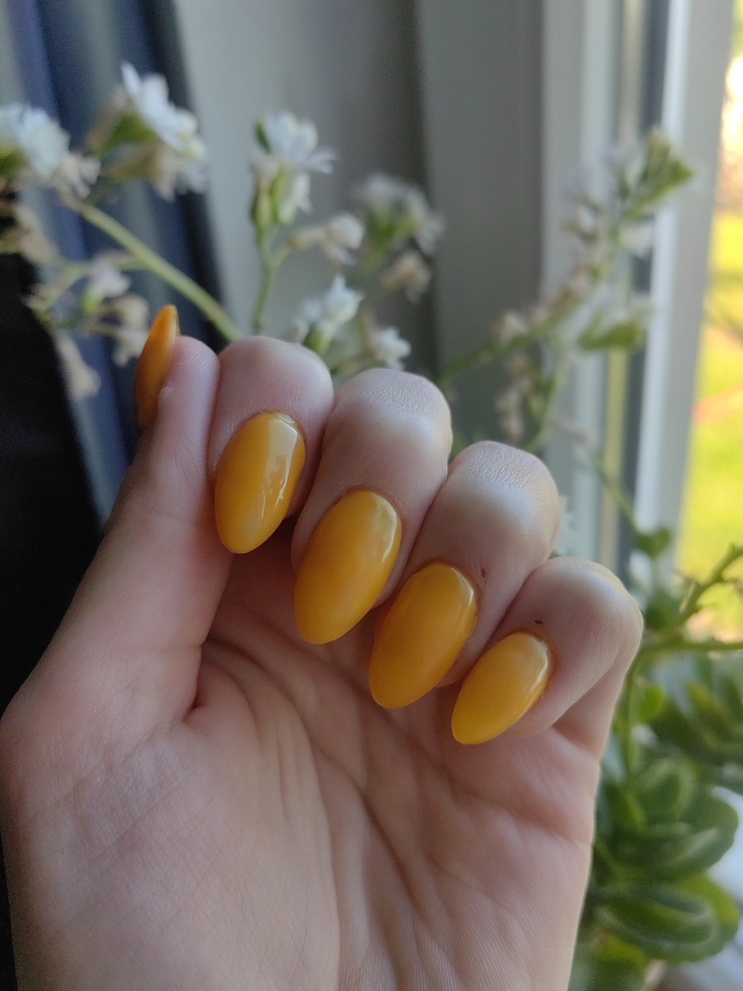 A close-up photograph depicts a human hand with manicured nails painted a glossy, opaque yellow. The nails are almond-shaped. The hand is positioned against a background featuring blurred white flowers and greenery. The setting appears to be indoors, possibly near a window, as suggested by the natural light. The location of Dolna Kremena, Bulgaria is not evident from the image.