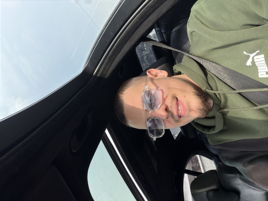 An individual is depicted in the driver's seat of a vehicle in the city of Yoakim Gruevo, Bulgaria. The subject is a male with short, dark hair and a neatly trimmed goatee and mustache, wearing clear-framed, slightly blue-tinted octagonal glasses. He is dressed in an olive green and dark color-block hoodie featuring a white "PUMA" logo on the chest, and a dark seatbelt is secured across his chest. He exhibits a slight smile and is looking directly at the camera. The car's interior features black leather seats and a black headliner. Above, a panoramic sunroof is open, revealing a bright, partly cloudy sky and indicating an outdoor setting with prominent sunlight.