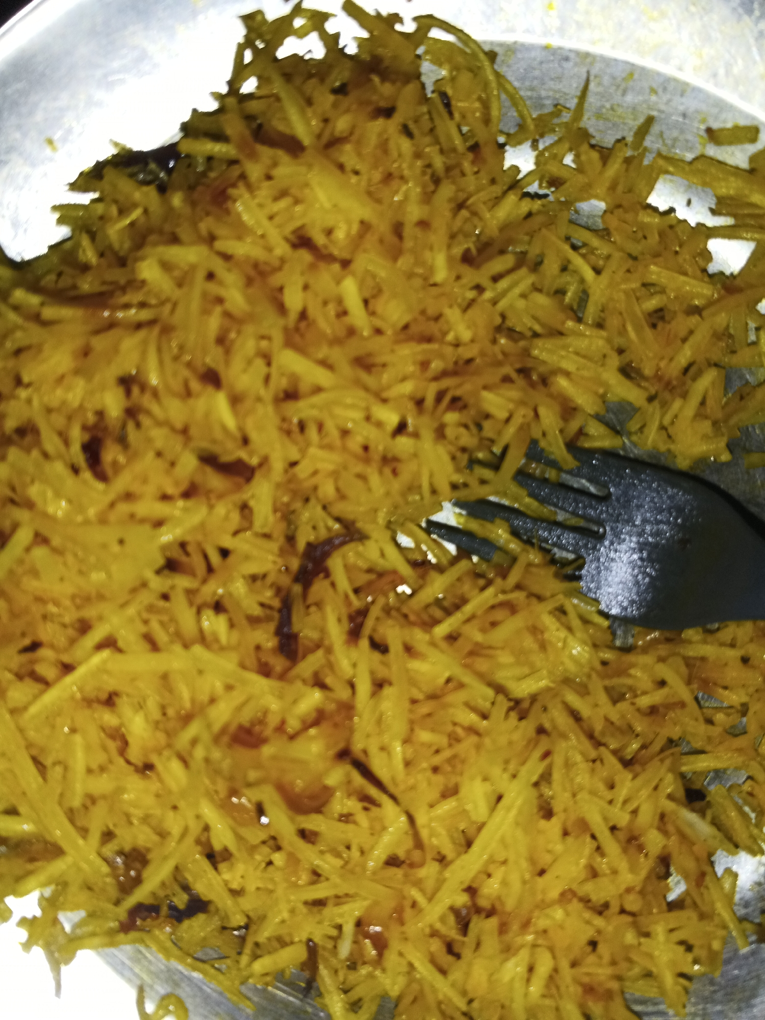 - "A close-up shot depicts a metallic bowl filled with grated, yellowish food, possibly carrots, with a dark plastic fork partially submerged in the mixture" by FM-upI1v2, licensed under CC BY 4.0
