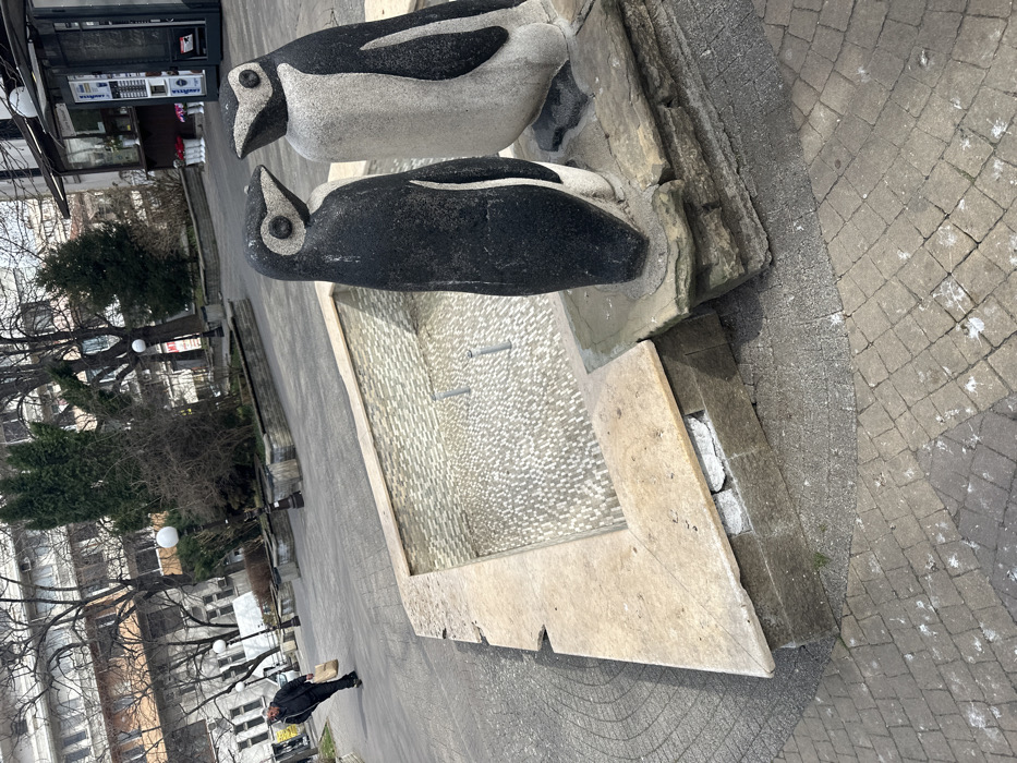 The image depicts a public park or square in Stara Zagora, Bulgaria, under daylight conditions. In the mid-foreground, two weathered, stylized penguin statues stand on a low, multi-tiered stone pedestal. The left penguin is predominantly dark grey with light grey facial and ventral markings, while the right penguin is light grey with dark grey dorsal, flipper, and facial markings; both face each other. Adjacent to the statues on the left is an empty, square-shaped fountain basin, its interior lined with small, light-colored mosaic tiles, from which two grey metal pipes protrude vertically. The fountain's light brown stone perimeter exhibits chipped edges and exposed structural elements. The ground is paved with grey cobblestones, featuring scattered white bird droppings, and transitions to a smoother, darker grey path. In the upper-left background, a single adult male, dressed in dark attire, walks towards the left, carrying a light brown paper bag in his right hand. The background environment consists of numerous bare deciduous trees, some evergreen shrubs, spherical streetlights, and multi-story urban buildings. A small kiosk, displaying Lavazza branding and flowers, is visible in the upper-right background.