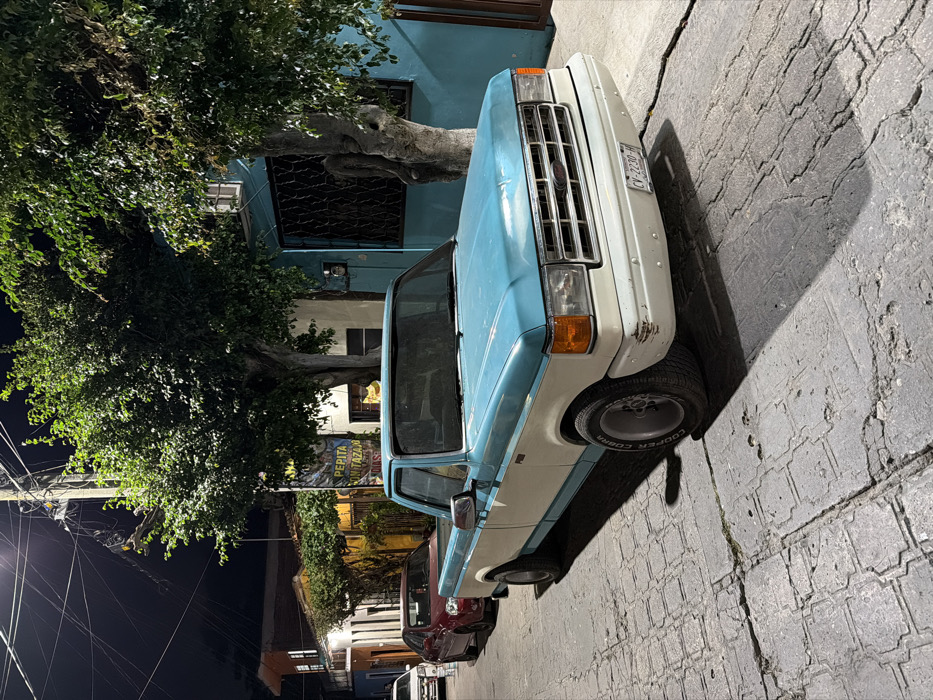A blue and white pickup truck is parked diagonally on a brick-paved street. It is beside a teal building with a tree obscuring part of the view. Street lights are visible on the left. Other cars are parked behind the pickup. The scene is well-lit, and the street appears to be in a residential area.