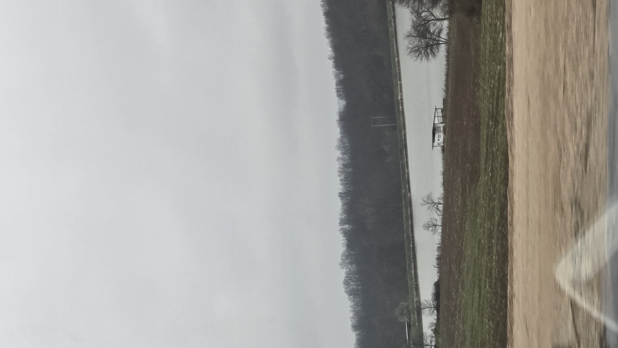 This image depicts a rural landscape near Nikolaevo, Bulgaria, under an overcast sky. The upper third of the frame shows a solid light gray sky. Below this, a dark, dense band of bare deciduous trees forms a distant tree line, obscuring a hill or ridge. In the mid-ground, a calm body of water, appearing light gray due to the overcast conditions, stretches horizontally across the scene, situated directly in front of the distant tree line. A utility pole structure, consisting of two vertical dark posts connected by a horizontal beam, is visible on the far side of the water, positioned against the tree line towards the right. Between the water and the immediate foreground is a gentle slope of land. This area exhibits two distinct sections: an upper strip of brown, possibly tilled soil, and a lower strip of green vegetation, indicating a field or pasture. Several bare trees with visible branches are scattered across this slope, particularly near the water's edge. A small, light-colored building, possibly a shed or shelter, with a dark, sloped roof and an awning, is situated on the brown soil section of the slope, close to the water's edge on the right side of the frame. No individuals are visible in the scene. The immediate foreground, occupying the bottom quarter of the image, consists of a blurred, predominantly light brown or tan area, possibly indicating a road or another field. A bright, indistinct reflection or glare is visible in the very bottom center of the frame.
