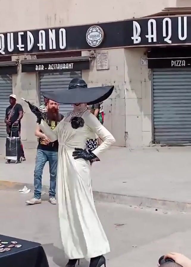 person dressed in cosplay as Lady Dimitrescu from the video game Resident Evil Village standing on a sidewalk and posing for photographs. The cosplayer wears a large black hat, black gloves, a long white dress, black shoes, and a pendant necklace. The background includes a street with a building that has a sign for a bar and restaurant, and a partially-closed storefront with a sign that says "PIZZA - TRAGOS." Several people walk by on the sidewalk and in the street, and a person with a camera and backpack kneels in the foreground to take a photo. The cosplayer poses for a few moments before the video ends.