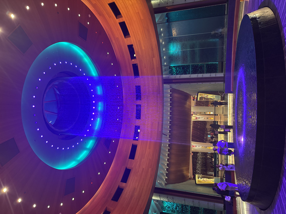 The image depicts a grand, multi-story indoor atrium located within the Hollywood Seminole Reservation, United States of America. In the foreground, a large, dark, circular water basin contains water illuminated with purple light, featuring a small central jet. Above, a massive circular ceiling installation serves as a central water feature, emitting a wide curtain of water intensely lit in blue. This overhead structure also incorporates a ring of teal perimeter lights and numerous recessed spotlights. The atrium's curved walls are predominantly clad in light-toned wood paneling, interspersed with horizontal rectangular openings. On the side walls, vertical water features comprised of glass panels with flowing water are visible, illuminated by teal and green backlighting. In the background, a large, elaborately designed, arched entrance, topped by an inverted wooden boat-like structure, provides access to another brightly lit interior space. Ten individuals are present within the scene, including a group of three adults on the left near the fountain, three men centrally located near the fountain, and additional figures near the background entrance. The entire environment is artificially lit by a combination of blue, purple, teal, and warm white light sources.
