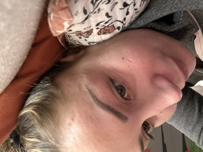 A close-up, rotated view shows a woman's face, partially obscured by bedding and a patterned cushion. One eye is prominently visible, with a light brown iris and surrounding eyelashes. The eyebrow is defined and neatly shaped. Her skin tone appears fair, with a small mole near the hairline. Part of her nose and lips are visible. She seems to be reclining on an orange and white surface next to a gray garment.