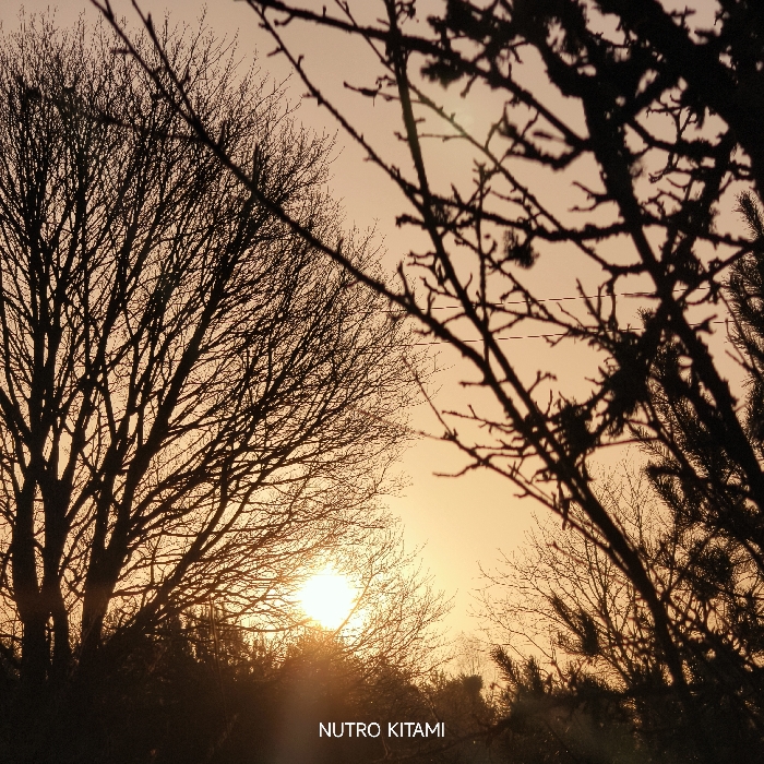 The image captures an outdoor scene at either sunrise or sunset in what is identified as Парэчча, Belarus. The sky displays a gradient of golden orange and pale peach tones. The sun, a bright circular light source with visible lens flare, is positioned low in the left-center, partially obscured by a dark silhouette of tree branches. A large, bare deciduous tree with intricate, leafless branches forms a prominent silhouette on the left side, extending towards the top of the frame. On the right, a cluster of silhouetted tree branches, some appearing coniferous with dense, needle-like foliage and others deciduous, occupies the foreground. A dark, indistinct line of vegetation defines the lower horizon. Faint, thin horizontal wires are visible traversing the silhouetted branches in the upper right quadrant. No individuals, specific actions, or interactions are present. The text "NUTRO KITAMI" is watermarked in white at the bottom center of the image.
