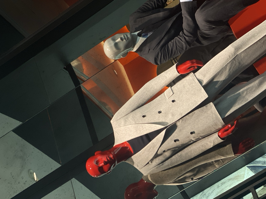 Reflections of two mannequins in suits angled against a mirrored surface