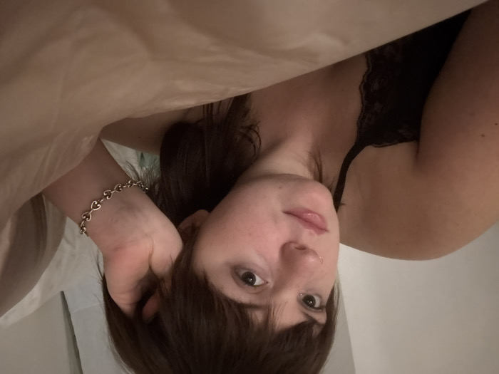 A woman lies on her side under a sheet, gazing at the camera. She has dark hair with bangs and fair skin. She is wearing a black lace top. A bracelet made of small heart shapes is visible on her wrist. The background is out of focus.