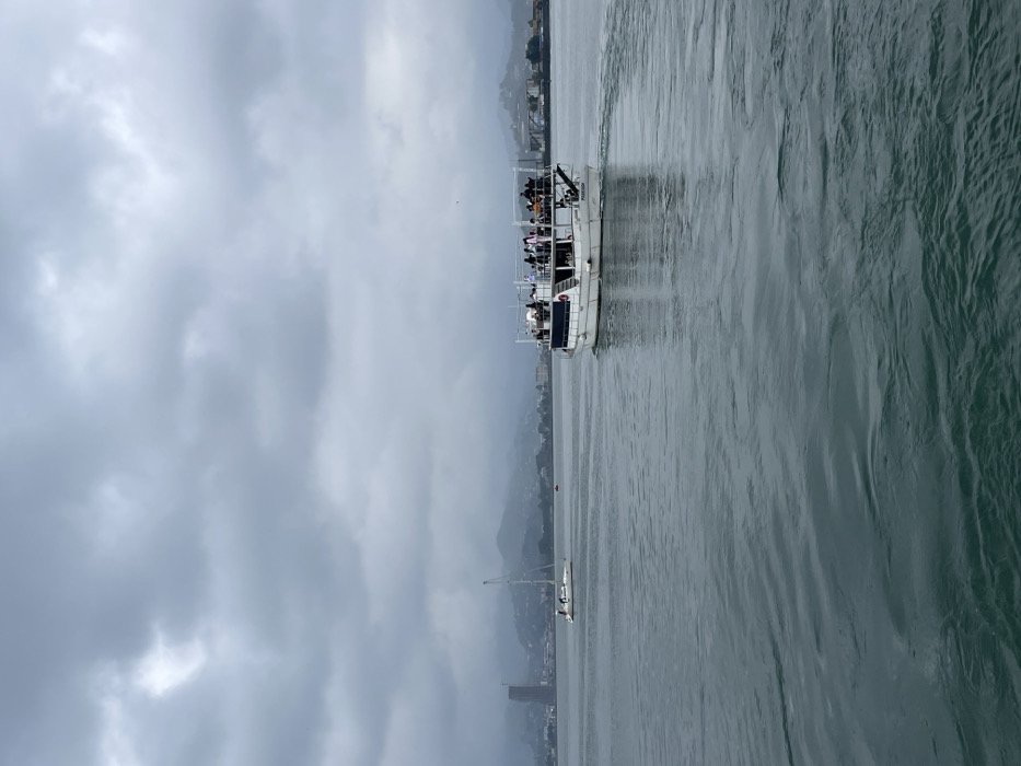 The image depicts a maritime scene in Batumi, Georgia, under an overcast sky. The foreground and midground consist of the Black Sea, exhibiting a dark green-blue hue with ripples and wakes. In the mid-right, a two-deck white passenger vessel, identified as "PARAMOON" on its stern, moves from right to left, generating a visible wake behind it. Approximately 15-20 individuals are visible on the upper deck, standing and observing the surroundings. A smaller, single-masted white sailboat with its sails furled is positioned in the mid-left, also moving towards the left. A small red buoy is visible in the water between the two vessels. The background shows the Batumi coastline and surrounding mountainous terrain. The city skyline features several buildings, including a prominent modern high-rise on the left. The mountains are partially obscured by atmospheric haze and low-hanging clouds, blending with the grey overcast sky that dominates the upper half of the image. No direct interactions between people are discernible beyond their collective presence on the passenger vessel.