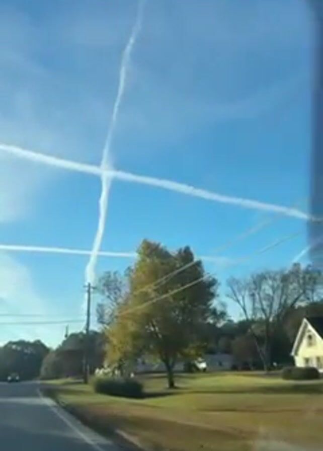 car driving on a paved road through a suburban or rural area, with houses and trees visible on either side of the road. In the sky, several contrails are visible, intersecting to form cross-like shapes against the blue sky. The car is moving forward, and the camera is pointed upward through the windshield to capture the view of the sky and the surrounding landscape. The video appears to be taken during the daytime, with clear weather.
