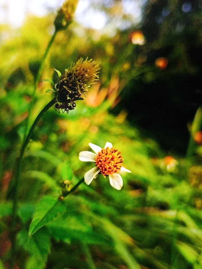 The image displays a close-up view of a natural outdoor scene in Unknown, Unknown. A single white flower with a prominent orange-yellow disc center is positioned in the lower-right portion of the frame, growing on a green stem. Above and slightly to the left of this flower, a brown, spiky, dried flower head or seed pod is visible on another stem. A dark-bodied ant is observed clinging to the underside of this spiky structure. The background consists of extensively blurred green foliage, with diffuse yellow and orange light sources, indicating a vegetated environment under daylight conditions. No human subjects are present.