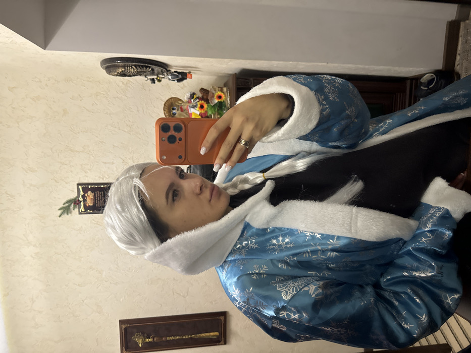 A female individual is depicted indoors, taking a selfie in Vysokinichi, Russia. She is wearing a light blue costume featuring silver snowflake patterns and white faux fur trim on the hood, lapels, and cuffs, over a black garment. A silver-colored wig styled into a single braid, secured with a light blue elastic band, covers her natural dark hair, which is visible at the hairline. Her left hand, adorned with a ring on the fourth finger and white painted fingernails, holds an orange-cased smartphone, reflecting her image. The background consists of a textured light beige wall. On the left, a rectangular wooden frame containing a decorative scepter is mounted. Above the subject's head, a dark rectangular plaque with a sprig of green foliage and red berries is visible. To the right, an ornate dark circular wall decoration is present, and below it, a colorful figurine stands on a dark wooden furniture piece.