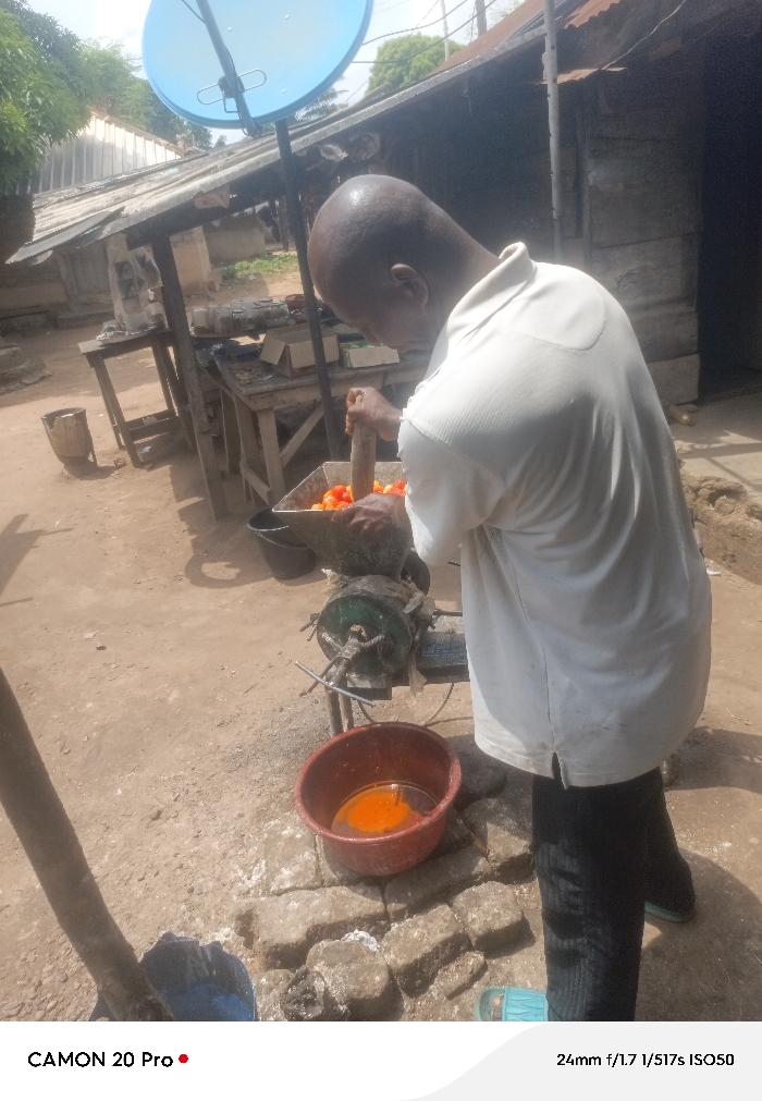 In Makurdi, Nigeria, an outdoor scene depicts an adult male operating a tomato grinding machine
