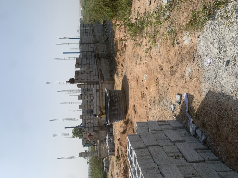 A partially constructed building of gray cinder blocks stands on a dirt lot, interspersed with rebar