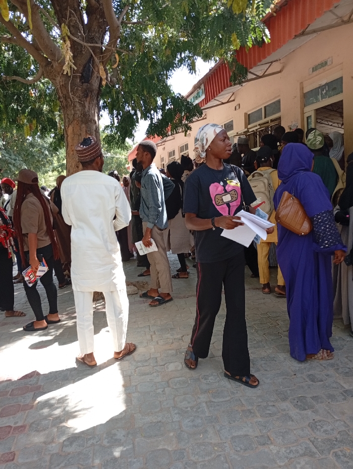 The image depicts an outdoor, daytime scene in Dabawa, Nigeria, characterized by a gathering of numerous individuals near a light-colored building under bright sunlight