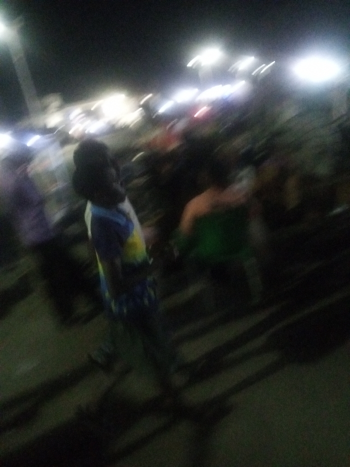 A nighttime scene shows blurry figures standing in a dimly lit area, likely a crowded space due to the density of people. Streetlights or bright overhead lights are visible in the background, casting harsh shadows on the ground. The figures appear to be wearing casual clothing. The photograph is heavily blurred, making it difficult to discern distinct details or actions.