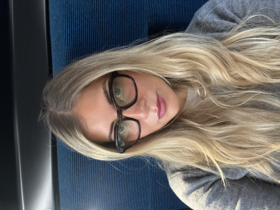 An adult female with long, wavy blonde hair and visible dark roots is depicted in a close-up, frontal portrait, positioned within an interior setting, likely a vehicle, in Avignon, France. She wears dark, thick-rimmed eyeglasses that reveal her green eyes, and her lips are colored with a berry-toned lipstick. Her attire consists of a grey knitted sweater over a lighter-colored undergarment, partially visible. Behind her, a blue fabric seat with horizontal ribbing is apparent, topped by a dark, indeterminate overhead structure. The individual gazes directly forward, capturing the scene in what appears to be a selfie.