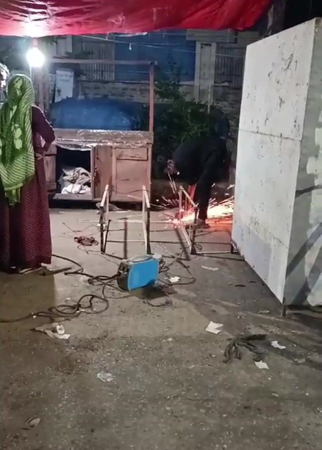 A stationary, eye-level shot shows a man welding a small metal frame on an asphalt surface in an outdoor setting. A woman in a green patterned headscarf and a burgundy dress stands to the left, looking at the scene. Another individual walks past briefly in a blue shirt. Behind the welder is a wooden cart covered with a blue tarp. To the right is a large white rectangular slab of unknown material. Overhead, a large red sheet hangs as a makeshift roof. Welding sparks illuminate the immediate area around the welder. Various tools and wires are scattered on the ground around the frame and welding machine. The background includes parts of buildings and some greenery.