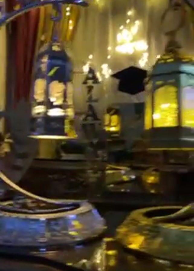 room decorated with Ramadan-themed decorations. There are several ornate, crescent moon-shaped stands holding lanterns. The lanterns are lit and cast a warm glow. In the background, there are shimmering curtains and string lights, adding to the festive atmosphere. Other objects are visible, including what appears to be a graduation cap and a decorative leaf. The video has dynamic lighting, shifting between warm yellow and cool blue tones. Overall, the scene is elaborately decorated and celebrates a special occasion.