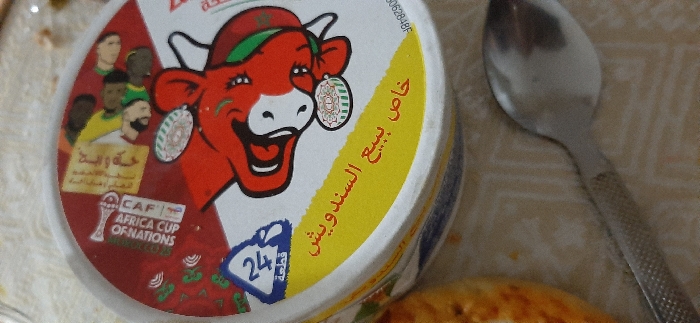 The scene is situated in the city of Meknes, Morocco, depicting a close-up, top-down view of a partially consumed meal or snack on a light-colored, patterned surface, likely a tablecloth. The primary subject is a white, cylindrical food container with a colorful lid. The lid features a predominantly red background with a yellow band along its lower edge. Prominent graphics include a cartoon red cow head with white markings and green ears, holding a small circular object. Above the cow, a character in a yellow shirt and green shorts is depicted. Arabic text on the yellow band reads "خاص ببيع السندويش" (Special for sandwich sale). A blue triangle containing "24 قطعة" (24 pieces) is visible on the lid. Further branding includes the "CAF AFRICA CUP OF NATIONS" logo and a trophy graphic. A partial product code, "0062848F," is visible on the right side of the lid. Adjacent to the container, a metal spoon with a textured handle is angled across the lower right portion of the frame. In the lower-left, a portion of a round, light brown food item, resembling bread or pastry with baked spots, is visible. No people or specific actions are depicted in the frame.