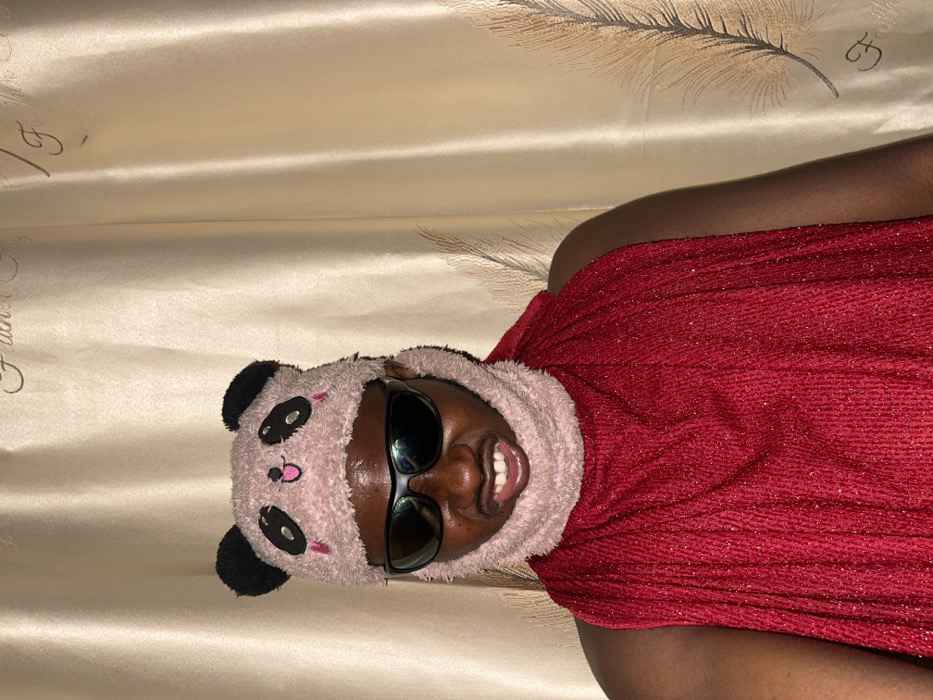 A person wearing a pink panda hat with black ears and sunglasses is lying on a light yellow surface. The individual has brown skin and is wearing a red, glittery shirt. The background features a fabric with a floral design.