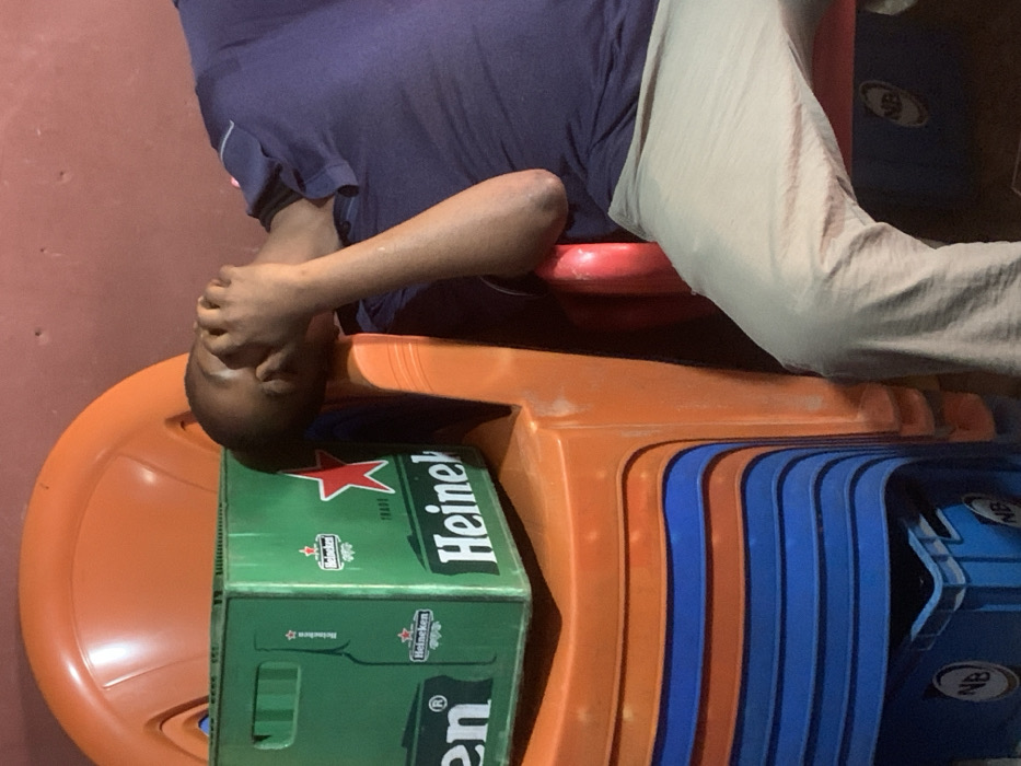 n adult male in a casual setting within Onitsha, Nigeria. He is seated on a red plastic chair, leaning back, wearing a navy blue polo shirt and light tan trousers. His right hand covers his face and eyes, with visible perspiration on his arm. To his left, a green plastic Heineken beer crate is positioned on top of a stack of several orange plastic chairs. Below these, a stack of blue plastic chairs is visible, and at the bottom, a blue plastic crate bearing the "NB" logo is partially visible. The background consists of a reddish-brown wall. The lighting appears dim, casting shadows.
