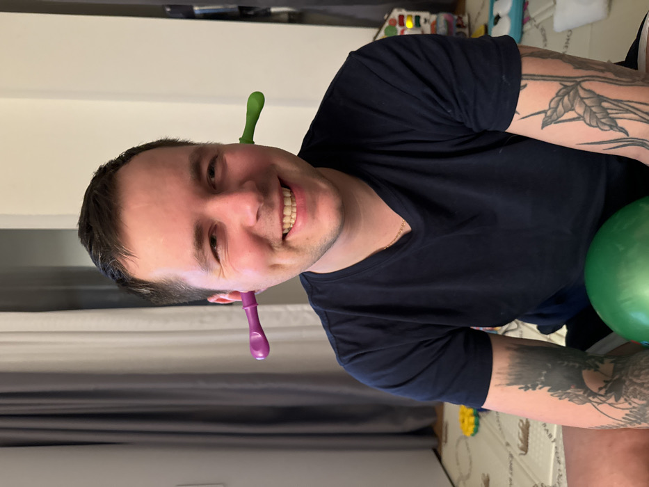 A smiling man with short dark hair and tattoos on both arms is seen wearing a navy blue t-shirt. He has a green ear pick inserted into his left ear and a purple one in his right ear. The background includes a gray curtain, a wall, and other blurred objects. A green balloon is visible near his right arm. The scene appears to be indoors.