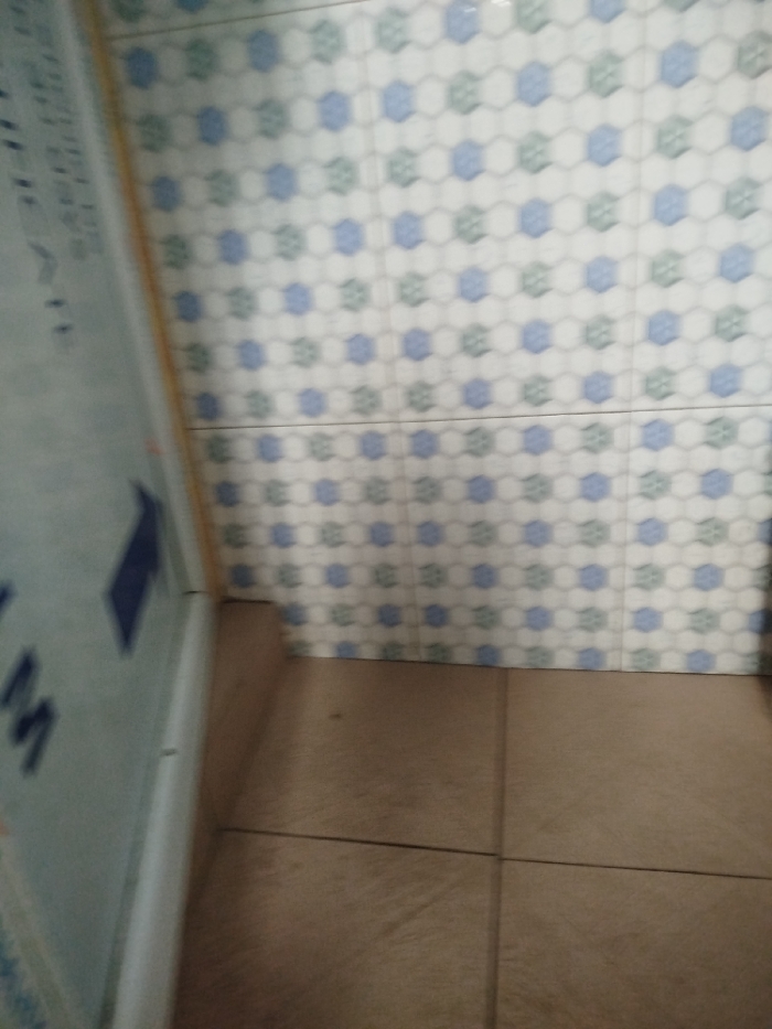 The image displays an indoor corner within a structure located in the city of Aba, Nigeria. The background features a tiled wall composed of white hexagonal ceramic tiles, each containing either a light blue or light green hexagonal insert. A distinct horizontal grout line runs across the wall. The lower third of the image depicts a floor tiled with square, light brown ceramic tiles. On the left side, a vertical, light-colored panel is partially visible, displaying a dark blue right-pointing arrow and the partial letter 'M'. This panel has a thin, vertical, yellowish-brown trim along its right edge. No human figures or specific actions are present in the scene. Illumination is uniform.