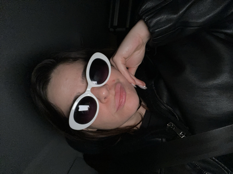 A woman with dark hair is reclining, wearing large white oval sunglasses