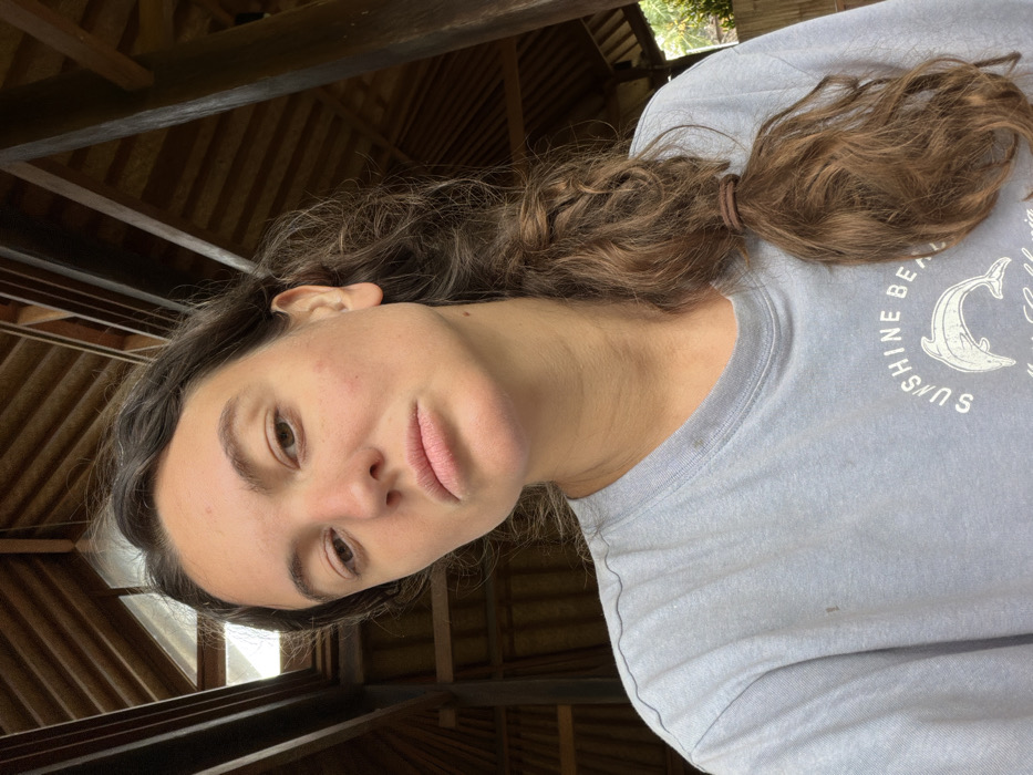 A woman with long, wavy brown hair loosely tied back, is captured in a tilted headshot. She is light-skinned and wears a light blue t-shirt with a white graphic of a marine animal and text. The background features wooden structures, possibly a hut or covered area, with light filtering through. Her expression is neutral, and the overall lighting is soft, highlighting the textures of the hair and surroundings.