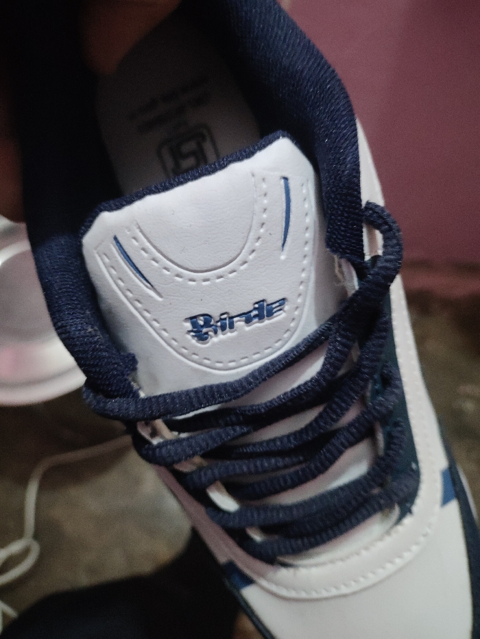 A close-up, slightly overhead photograph depicts the upper portion of a single athletic shoe, held or presented, against a blurred background. The shoe is primarily white with navy blue accents. Navy blue fabric laces are visible, tied in a standard criss-cross pattern over a white tongue. The brand name "Birde" is embroidered in blue script on the tongue. The shoe's collar and inner lining appear to be navy blue fabric. Inside the shoe, on the footbed or lining, a partially visible ISI (Indian Standards Institute) certification mark is present. The background consists of a blurred, reddish-pink vertical surface on the right and a darker, indistinct horizontal surface on the left. A small portion of a hand or fingers is faintly visible in the upper left corner of the frame, indicating manipulation of the shoe. No specific identifiable landmarks or unique architectural features are present in the image to pinpoint an exact location within Noida, India. However, the presence of the ISI mark and the "Birde" brand, an Indian footwear manufacturer, confirms the shoe's relevance to the Indian market, consistent with potential observation or sale in a city like Noida, India.