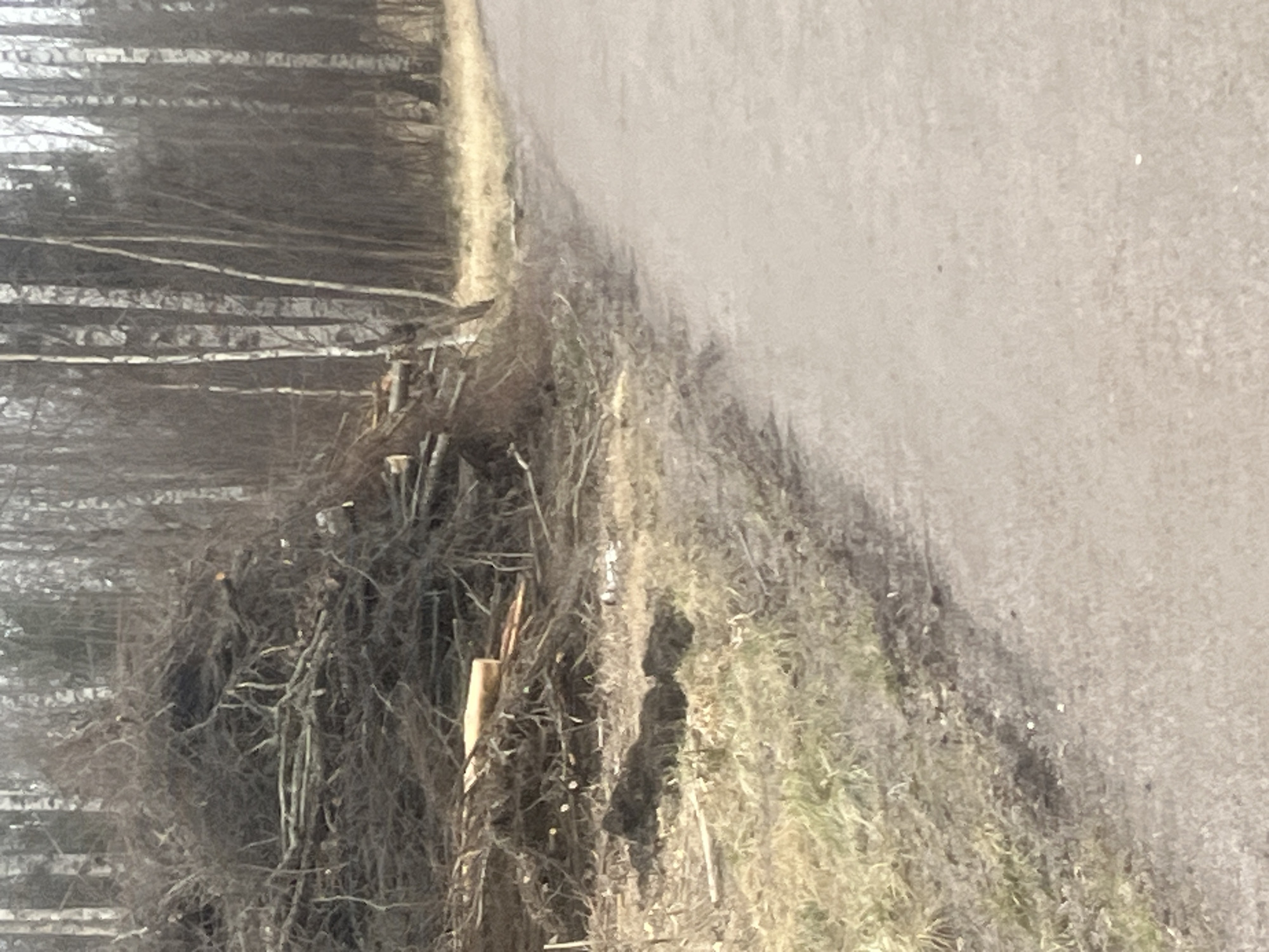 The image presents a roadside scene in what appears to be a forested area. To the left, a dense cluster of felled branches and wood debris is visible, possibly from recent tree trimming or logging. Behind the debris, there is a stand of trees with slender, light-colored trunks, characteristic of birch trees. The right side of the image is dominated by a paved road surface, suggesting the location is near a path or street. Vegetation is sparse along the road edge. Given the presence of birch trees and the general landscape, the scene is consistent with locations in Espoo, Finland, which is known for its forests and natural areas integrated with urban development.