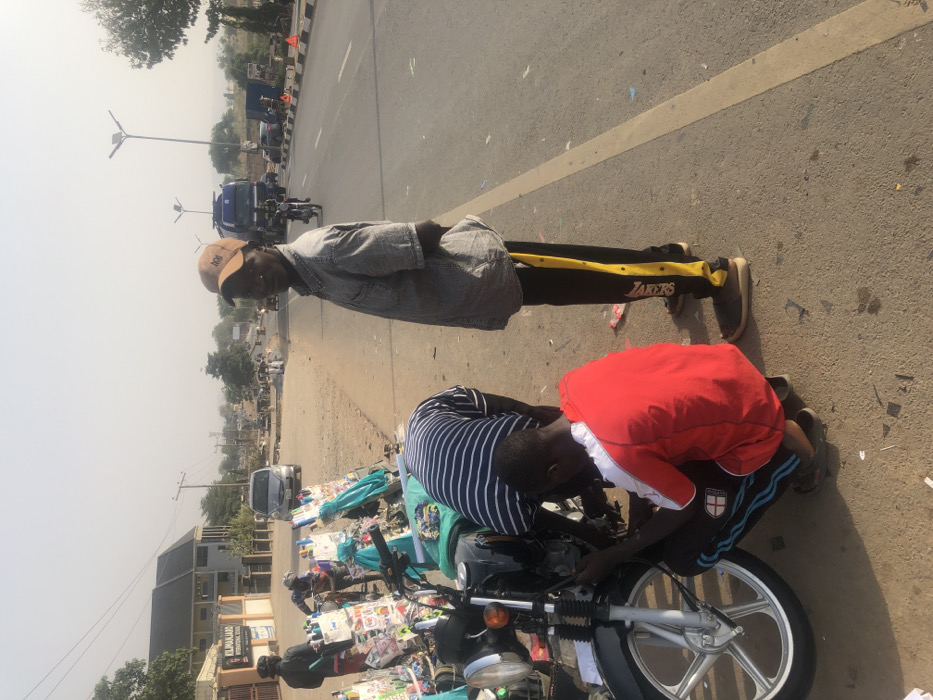 The scene depicts a roadside area in Karu, Nigeria, characterized by human activity and vehicular presence under a hazy sky. In the foreground, three males are present. A man wearing a brown cap, grey short-sleeved shirt, and black track pants with a yellow "LAKERS" stripe stands facing the camera, positioned on the right side of the frame. To his left, two other males are engaged with a dark-colored motorcycle. One man, wearing a blue and white striped shirt, is bent over the motorcycle's engine area, facing away from the camera. The other man, wearing a red and white shirt and dark track pants with blue stripes, crouches in front of the motorcycle, manipulating components near the front wheel and engine. Behind the working motorcycle, other motorcycles are visible, laden with large plastic bags filled with various packaged goods, indicative of roadside vending. The ground is asphalt with scattered debris. In the midground, an asphalt road extends into the distance, marked with a solid yellow line. A silver car is visible on the left side of the road. Further down the road on the right, a large blue truck and another motorcycle are in motion or parked. Multiple streetlights with solar panels are spaced along the roadside. Orange traffic cones are visible further down the road on the right side. On the left side of the road, a two-story building prominently displays a sign reading "KILIMANJARO INTERNATIONAL SCHOOL." Distant hills and sparse vegetation frame the horizon under the pale, hazy sky.