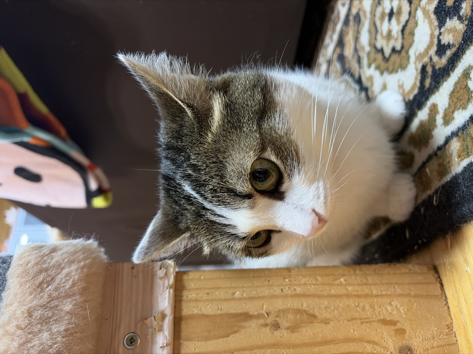 A cat with grey and white fur peers curiously from a wooden structure. Its green-yellow eyes are slightly widened, and its whiskers point forward. The cat is positioned above the camera, giving a downward angle. A brown and patterned carpet is visible in the background, along with a glimpse of a colorful object. The wooden structure is partially covered in beige fabric.