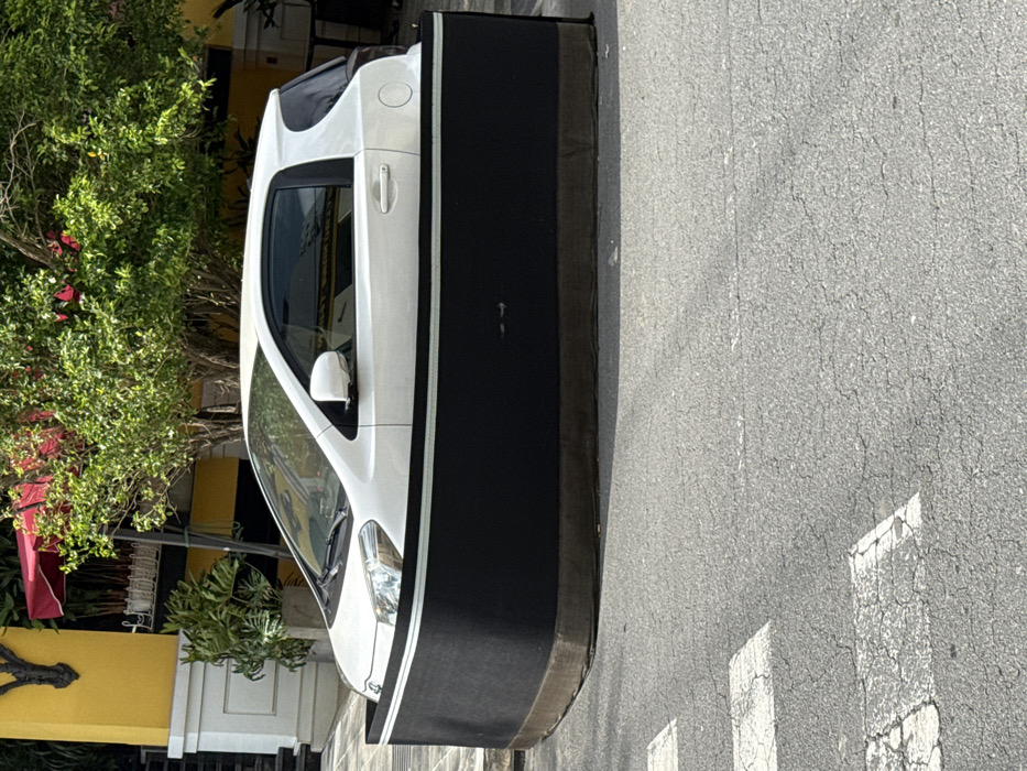 A white two-door hatchback vehicle is stationary on cracked asphalt pavement in An Hải Ward, Vietnam. The car is partially enveloped by a large, dark, curved rectangular structure, appearing as a promotional display or a modified outdoor furnishing. This structure is black with a narrow white horizontal stripe near its top edge and a brown base, obscuring the car's lower half and wheels. In the background, a building with a yellow facade, white trim, and a red awning is visible, accompanied by lush green trees and potted plants, indicating an urban commercial setting. The foreground asphalt features worn, faded white crosswalk markings. The scene is well-lit by daylight; no individuals or dynamic actions are depicted.