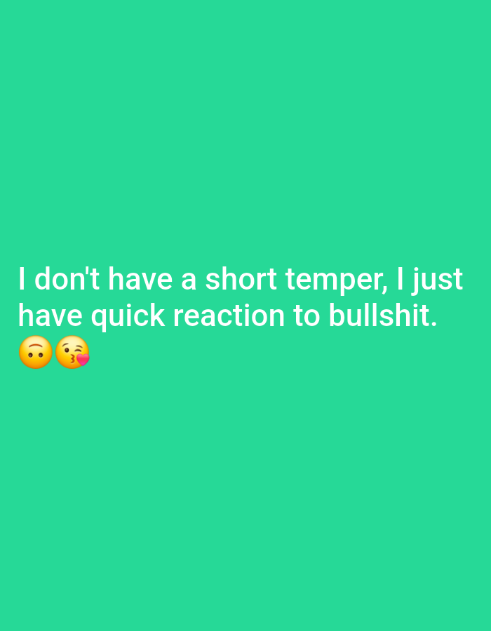 This image is a static digital graphic featuring white sans-serif text centered on a solid teal background. The text reads: "I don't have a short temper, I just have quick reaction to bullshit." Below the text, two yellow emojis are present: a slightly smiling face and a winking face blowing a red heart kiss. The scene lacks a discernible physical location within the city of Unknown, Unknown, as it is a digitally rendered image. No people, physical objects, actions, or interactions are depicted; the environment is entirely digital.