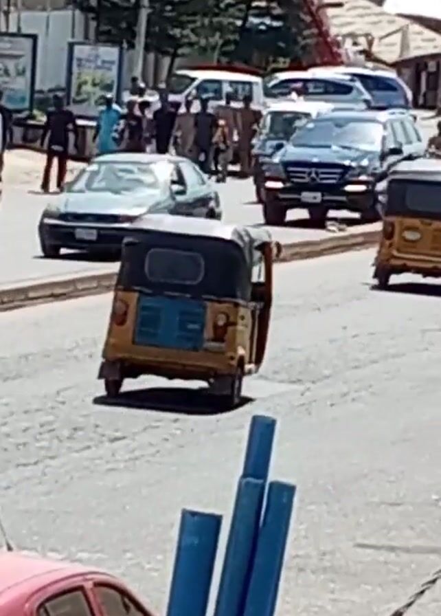 street scene with multiple vehicles and pedestrians in an urban environment. Several "keke napep" three-wheeled vehicles, cars (including a black Mercedes SUV and a red car), and motorcycles are visible on the road. A group of people are walking along the sidewalk and crossing the street. Some are dressed in traditional Nigerian attire. There are buildings in the background and street signs. Blue construction pipes are in the foreground. The day is sunny. The camera angle is slightly elevated, providing a view of the street from a higher vantage point.