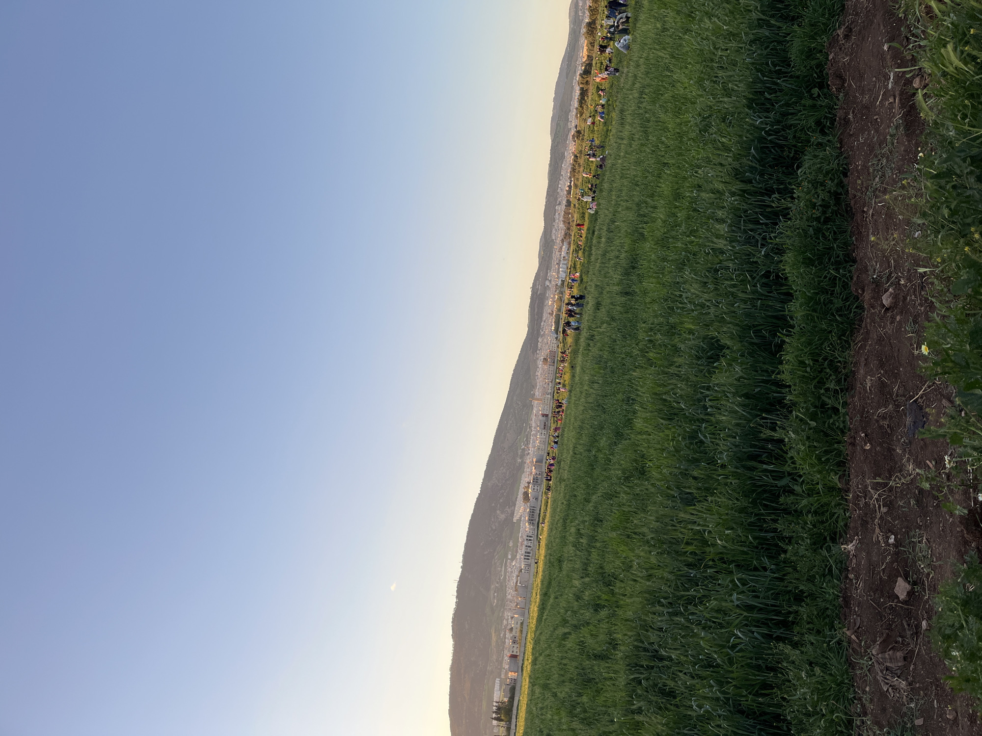 wide green field with rows of people sitting or lying down. The field borders a city with white buildings at the base of a mountain. The sky is clear blue transitioning to pale yellow near the horizon. The people appear to be gathered for an event or leisure activity. This is the city of Fez in Morocco.