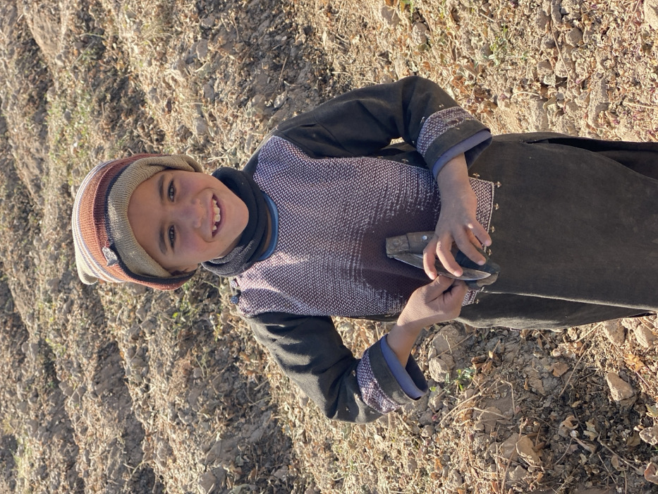 A young boy, approximately 6-8 years old, stands centered in a dry, tilled field in Mandisar, Afghanistan, under bright daylight. He wears a tan, brown, and orange striped beanie, a black neck warmer, and a dark-colored long-sleeved tunic with a lighter, patterned panel across the chest and decorative cuffs. The boy is smiling, revealing missing upper front teeth. His left hand is partially obscured, while his right hand holds a dark, metallic, folding-style hand tool, possibly a pruning shear or knife. The background consists of uneven, light brown soil with visible furrows and scattered dry plant debris, indicative of recently worked agricultural land.